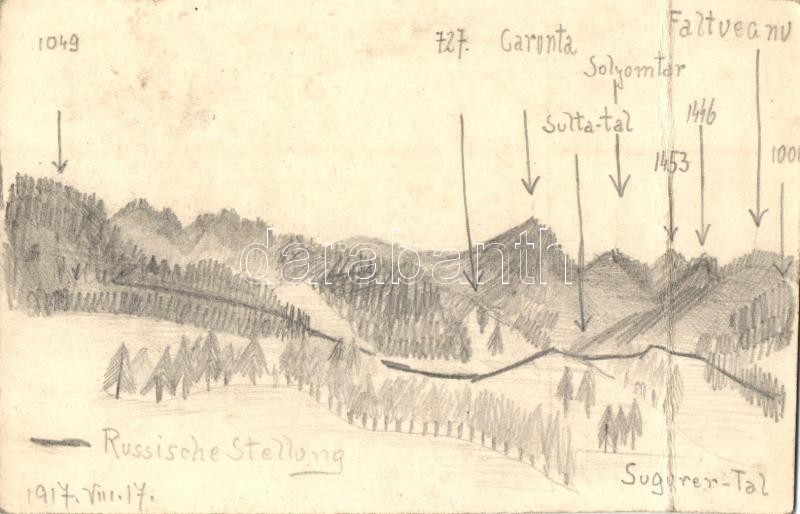 Leírás: 1917 Russische Stellung / Kézzel rajzolt osztrák-magyar tábori postai levelezőlap / WWI Austro-Hungarian K.u.K. hand-drawn military field post (fa)