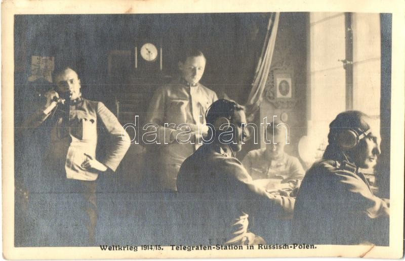 Weltkrieg 1914/15. Telegrafen-Station in Russisch-Polen / WWI Austro-Hungarian K.u.K. and German telegraph station in Russian Poland (Vistula Land), soldier with telephone, interior