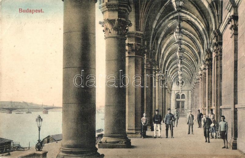 Leírás: Budapest V. Országház oszlopcsarnok a Dunával és Margit híddal (EK)