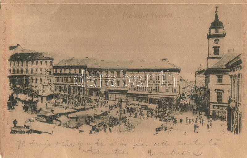 Leírás: Pécs, Széchényi tér, Gunsberger Mór üzlete, piac, kiadja Fischer Ferenc (EK)
