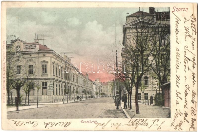 Sopron, Erzsébet út. Kiadja Kummert L. utóda (EK) https://www.darabanth.com/hu/323-Gyorsarveres/323.0/Kepeslapok/Magyarorszag~2500005/Sopron-Erzsebet-ut-Kiadja-Kummert-L-utoda-EK~II1794599