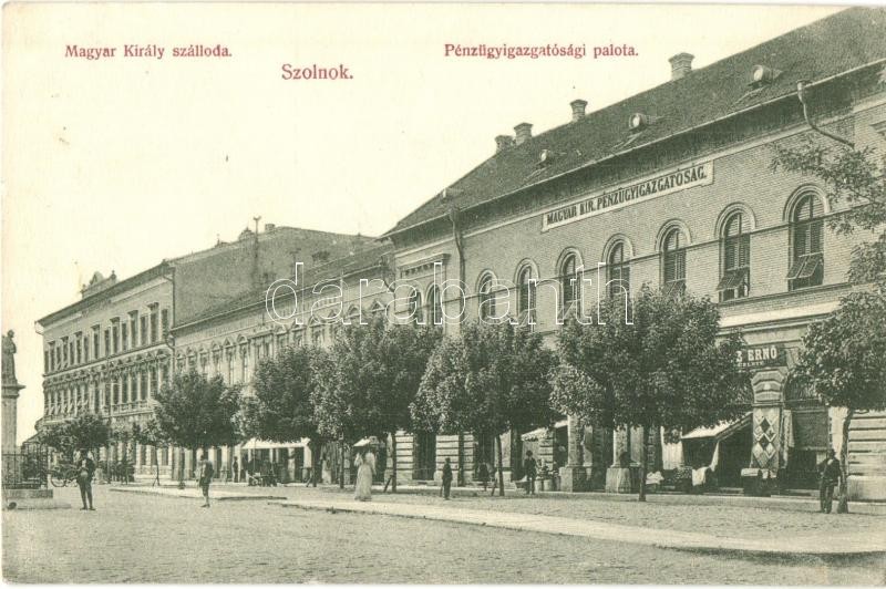 Leírás: Szolnok, Magyar Király szálloda, M. kir. Pénzügyi Igazgatósági palota, üzlet