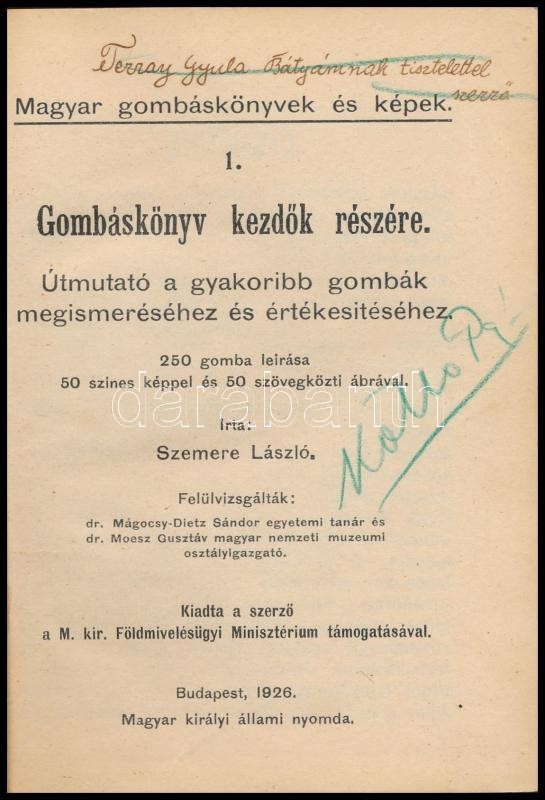 Szemere László: Gombáskönyv kezdők részére. Útmutató a gyakoribb gombák megismeréséhez és értékesítéséhez. 250 gomba leírása 50 színes képpel és 50 szövegközti ábrával. Bp., 1926, Magyar Királyi Állami Nyomda. Félvászon kötés, gerince hiányos, belül a lapok foltosak, színes képekkel illusztrált,