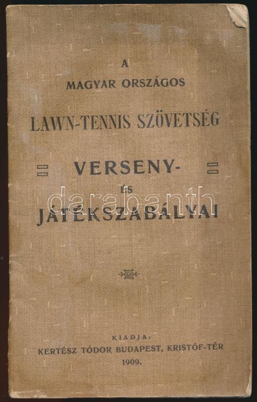 A Magyar Országos Lawn-Tennis Szövetség verseny és játékszabályai. Bp.,1909, Kertész Tódor, (Hedvig Sándor-ny.), 43+5 p. Kiadói papÃrkötés, foltos. Magyar Országos Lawn-Tennis Szövetség 1907-ben alakult. Korai verseny és játékszabályzat.