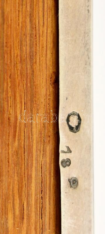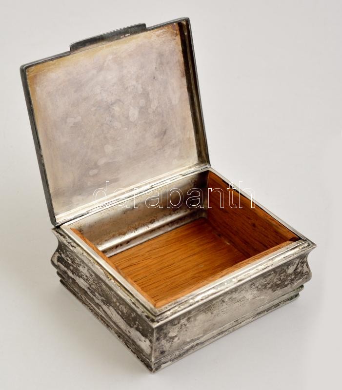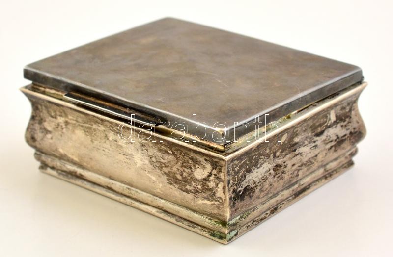 Leírás: Ezüst (Ag.) doboz, jelzett, hiányos fa betétekkel, nettó:158 g, 9×11 cm, m:5 cm