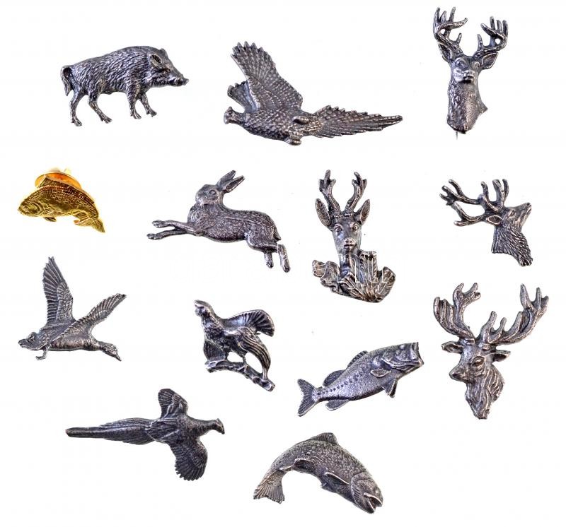 Leírás: 13db-os vegyes, klf erdei állatokat ábrázoló, fém, vadász és horgász jelvény, az egyik hal aranyozott T:2