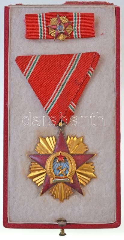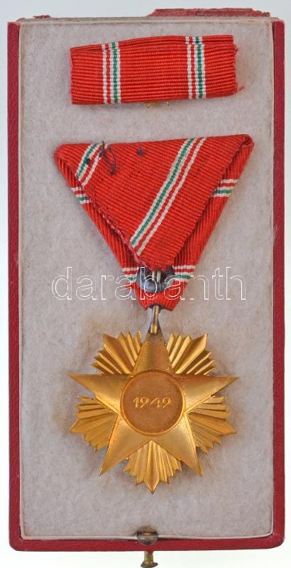 1949. "A Magyar Népköztársasági Érdemrend V. fokozata" zománcozott, aranyozott Br kitüntetés mellszalaggal, szalagsávval és miniatűrrel, sérült eredeti tokban T:1-,2