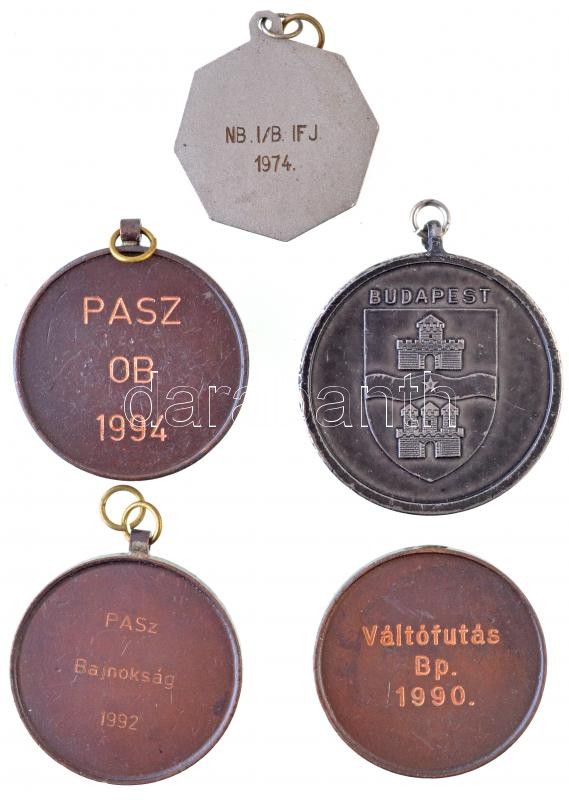 Leírás: 5db-os vegyes modern sportérem tétel, közte 1990. "Váltófutás Bp" Br sportérem fül nélkül, fülnyommal, 1992. "PASz Bajnokság" Br sportérem füllel T:2 ph.