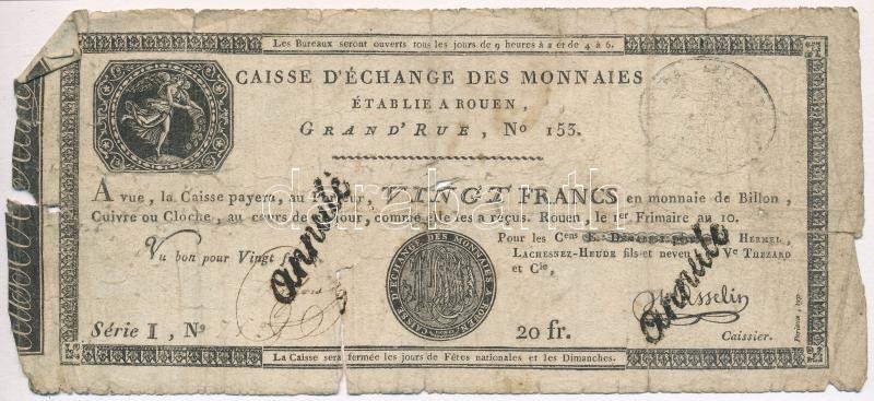 Franciaország / Rouen 1797-1803. 20Fr "annulé (érvénytelen)"... https://www.darabanth.com/hu/323-Gyorsarveres/323.0/Numizmatika/Kulfoldi-bankjegyek~2000011/Franciaorszag-Rouen-1797-1803-20Fr-annule-ervenytelen-felulbelyegzessel-TIV-France-~II1796621