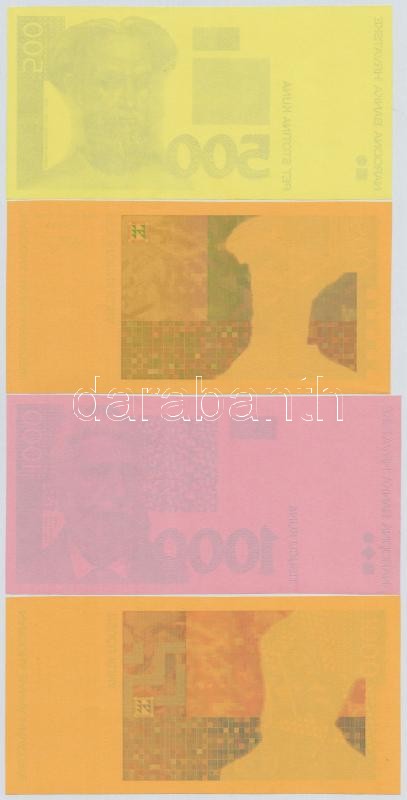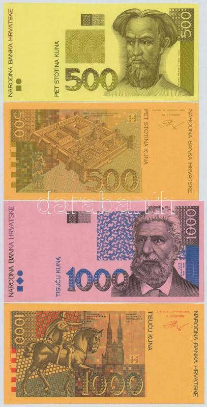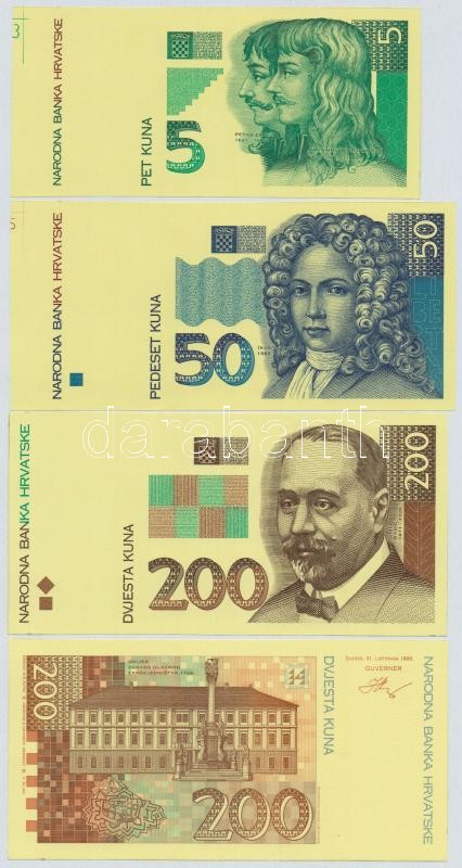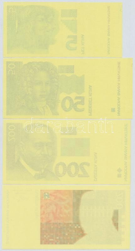 Horvátország 1993 (1994). 5K előlapi színpróba + 50K előlapi színpróba + 200K előlapi és hátlapi színpróba + 500K előlapi és hátlapi színpróba + 1000K előlapi és hátlapi színpróba. Összesen 8db, mind ívszéli darab, néhány látható illesztőkerettel T:I,I-
