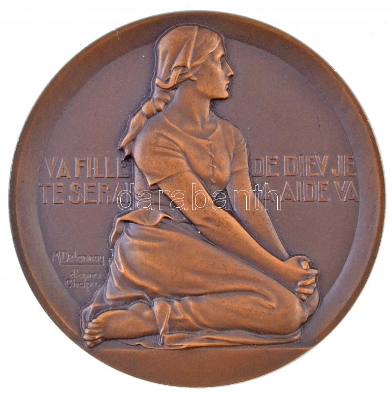 Leírás: Franciaország DN "VA FILLE DE DIEV JE TE SERAI A AIDE VA" kétoldalas Br plakett, peremen fémjel. Szign.: M. Delannoy (80mm) T:1-
