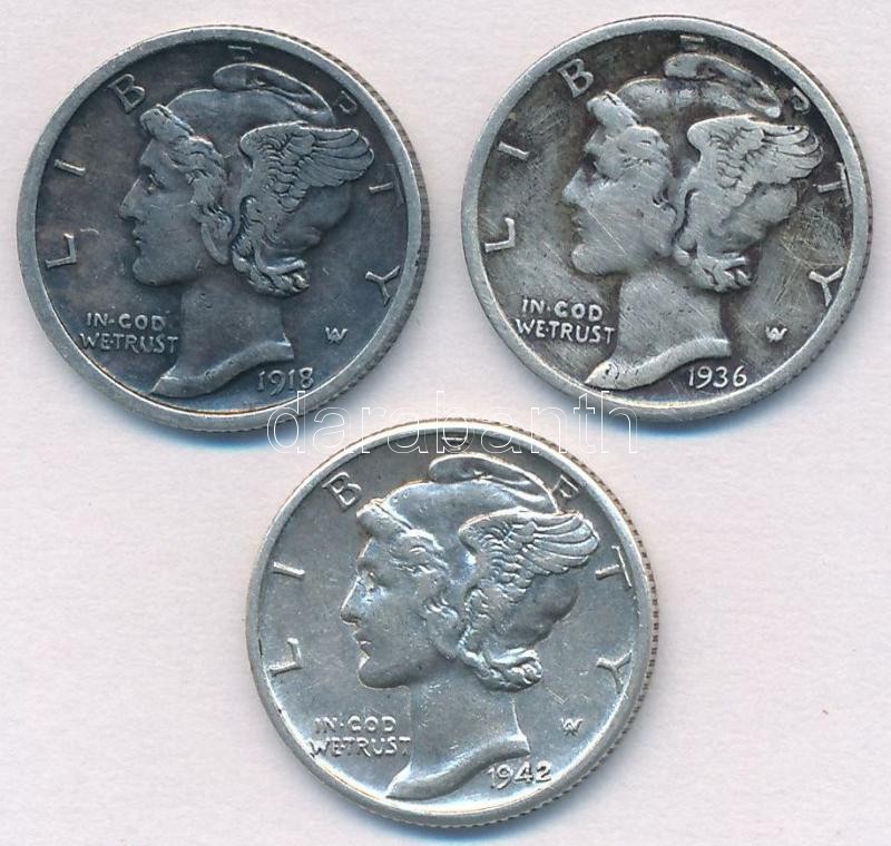 Amerikai Egyesült Államok 1918-1942. 1d Ag "Mercury" (3xklf)... https://www.darabanth.com/hu/323-Gyorsarveres/323.0/Numizmatika/Kulfoldi-fem-es-ezustpenzek~2000012/Amerikai-Egyesult-Allamok-1918-1942-1d-Ag-Mercury-3xklf-T1-2-patina-USA-1918-1942-1-Dime-~II1789102