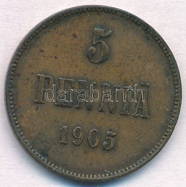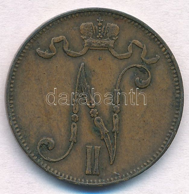 Finland 1905. 5 Pen... https://www.darabanth.com/hu/323-Gyorsarveres/323.0/Numizmatika/Kulfoldi-fem-es-ezustpenzek~2000012/Finnorszag-1905-5p-Cu-II-Miklos-T2-Finland-1905-5-Pennia-Cu-Nicholas-II-CXF-Krause-KM231~II1788568