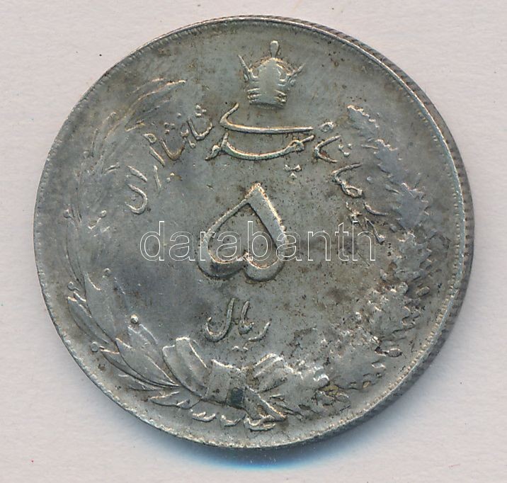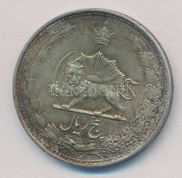 Iran 1944. (1323) 5 Rials Ag C:XF ... https://www.darabanth.com/hu/323-Gyorsarveres/323.0/Numizmatika/Kulfoldi-fem-es-ezustpenzek~2000012/Iran-1944-1323-5R-Ag-T2-patina-Iran-1944-1323-5-Rials-Ag-CXF-patina-Krause-KM231145~II1794032