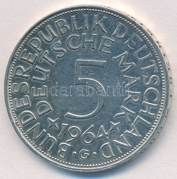 GFR 1964G 5 Mark Ag C:AU,XF https://www.darabanth.com/hu/323-Gyorsarveres/323.0/Numizmatika/Kulfoldi-fem-es-ezustpenzek~2000012/NSZK-1964G-5M-Ag-T1-2--GFR-1964G-5-Mark-Ag-CAU-XF~II1794462