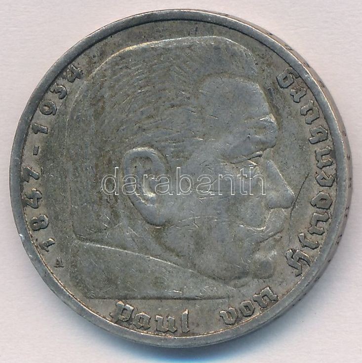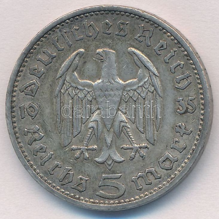 Germ... https://www.darabanth.com/hu/323-Gyorsarveres/323.0/Numizmatika/Kulfoldi-fem-es-ezustpenzek~2000012/Nemet-Harmadik-Birodalom-1935A-5M-Ag-Hindenburg-T2--German-Third-Reich-1935A-5-Mark-Ag-Hindenb~II1794638
