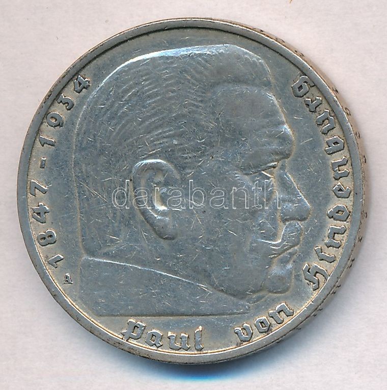 Germ... https://www.darabanth.com/hu/323-Gyorsarveres/323.0/Numizmatika/Kulfoldi-fem-es-ezustpenzek~2000012/Nemet-Harmadik-Birodalom-1936A-5M-Ag-Hindenburg-T2--German-Third-Reich-1936A-5-Mark-Ag-Hindenb~II1788445