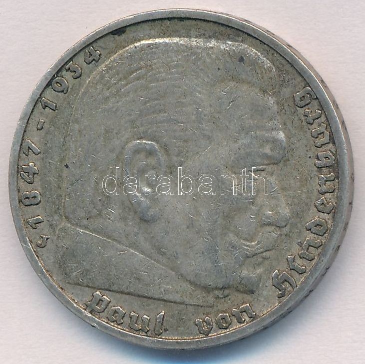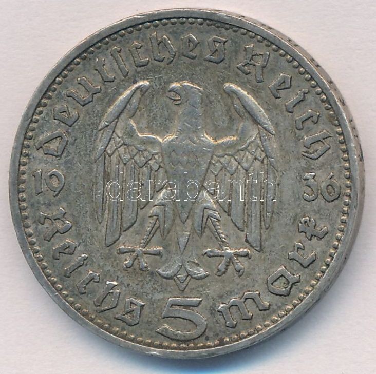 German Third Reich 1936A 5 Marks Ag "1st Anniversary of Nazi rule" C:XF patina