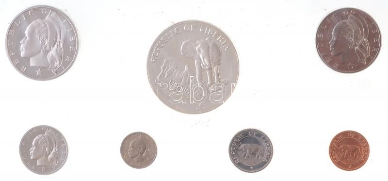 Liberia 1974. 1 Cent - 5 Dollar (7xdiff) coin set in original case, including 1974. 5 Dollars Ag "Elephant" C:UNC (originally PP)