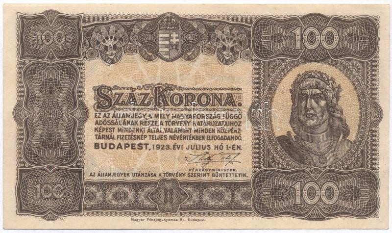 Leírás: 1923. 100K "Magyar Pénzjegynyomda Rt." nyomdahely jelöléssel T:I