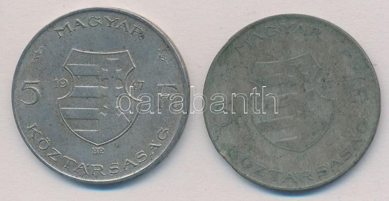 1947. 5Ft Ag "Kossuth" (2x) T:2-,3 patina https://www.darabanth.com/hu/323-Gyorsarveres/323.0/Numizmatika/Magyar-es-magyar-verdejelu-fem-es-ezustpenzek~2000007/1947-5Ft-Ag-Kossuth-2x-T2-3-patina~II1793672