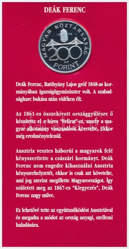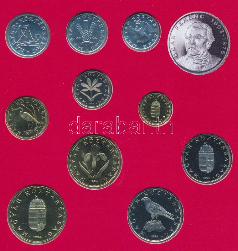 Leírás: 1994. 10f-200Ft (11xklf) forgalmi sor dísztokban, közte 1994. 200Ft Ag "Deák" T:PP Adamo FO27.1