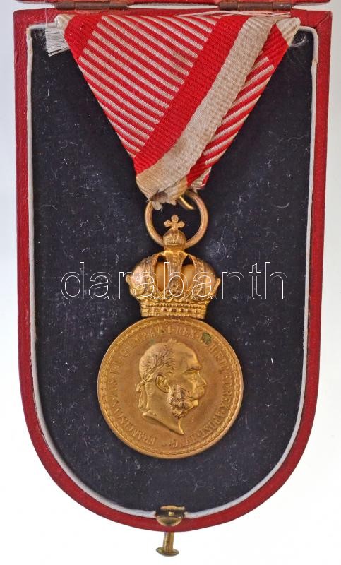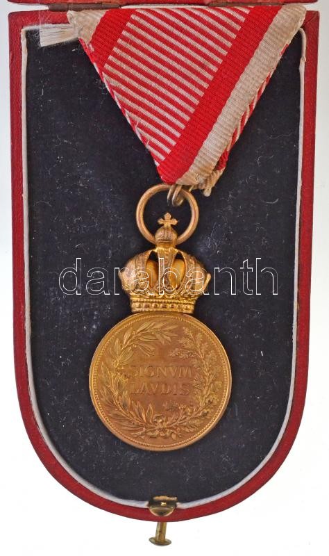 Hungary 1890. "Medal for Military Merit (Signum Laudis)" gold plated Br decoration with ribbon, in original but damaged case, with "Zimbler Wien VII" mark in case C:AU