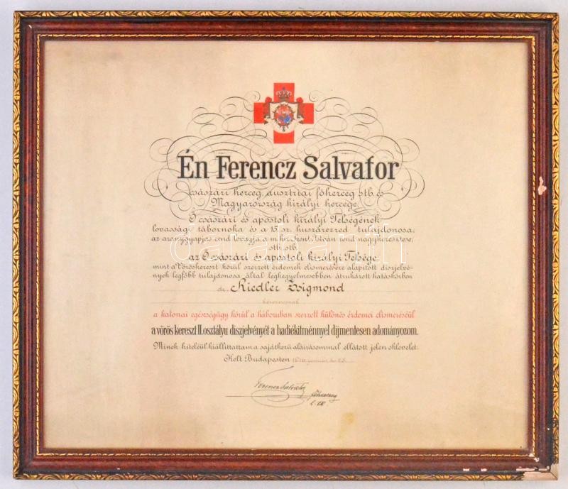 1916. "Vörös Kereszt II. Osztályú Díszjelvény hadidíszítménnyel" kitüntetés adományozó oklevele Ferenc Salvator főherceg facsimile aláírásával, bekeretezve. A kereten kisebb sérülésekkel (~54x47cm).