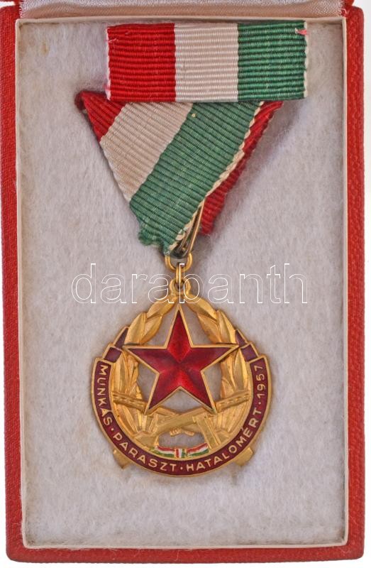 Leírás: 1957. "Munkás-Paraszt Hatalomért Emlékérem" aranyozott, zománcozott Br kitüntetés mellszalagon, eredeti dísztokban, szalagsávval T:1-