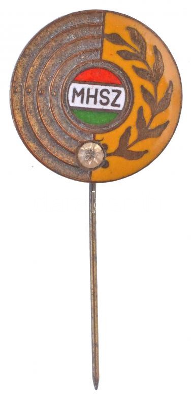 Leírás: ~1970. "MHSZ (Magyar Honvédelmi Szövetség)" zománcozott kitűző, benne műkő, eredeti, sérült dobozban (20,5mm) T:1-,2