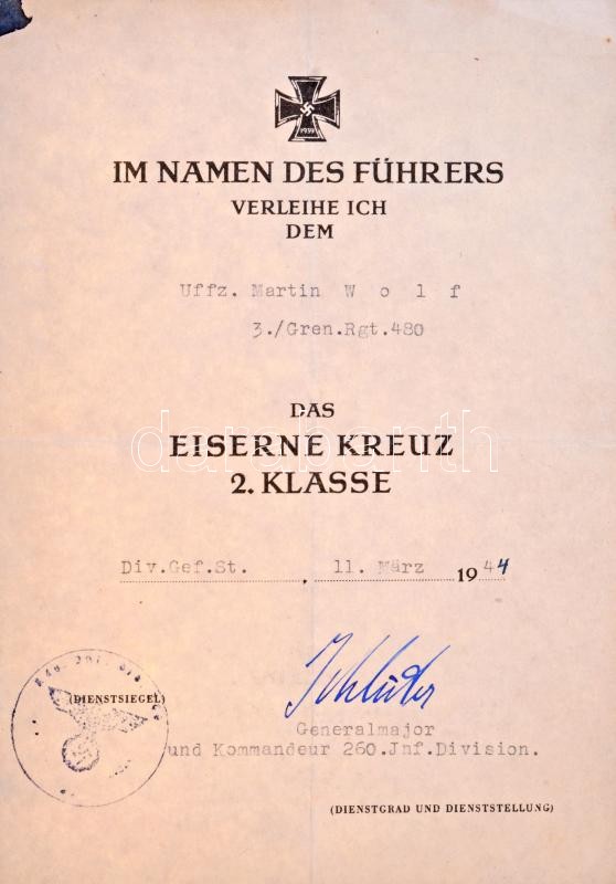 Német Harmadik. Birodalom 1939. "II. Osztályú Vaskereszt" kitüntetés, gyártói jelzés a karikán, mellszalaggal + Adományozói okirat, Robert Schlüter vezérőrnagy aláírásával T:2