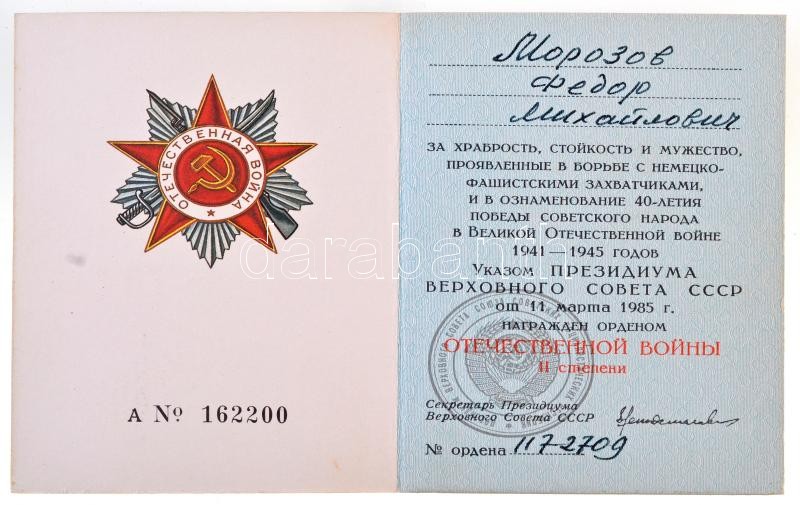 Szovjetunió 1985. "Honvédő Háború Érdemrend II. osztálya" ezüstözött, zománcozott kitüntetés, hátlapján sorszámmal, hozzátartozó adományozói okirattal (46mm) T:2