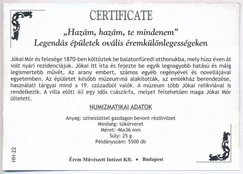 Leírás: DN "Hazám, hazám, te mindenem / Legendás épületek - Jókai Mór / Jókai Mór emlékház" ezüstözött Cu emlékérem tanúsítvánnyal (46x36mm) T:PP