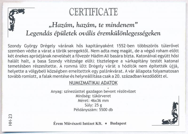 Leírás: DN "Hazám, hazám, te mindenem / Legendás épületek - Szondy György / Drégely vára" ezüstözött Cu emlékérem tanúsítvánnyal (46x36mm) T:PP