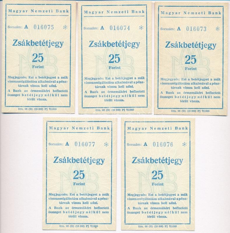 Leírás: Budapest DN Magyar Nemzeti Bank "Zsákbetétjegy" 25 Ft-ról (5x) sorszámkövetők