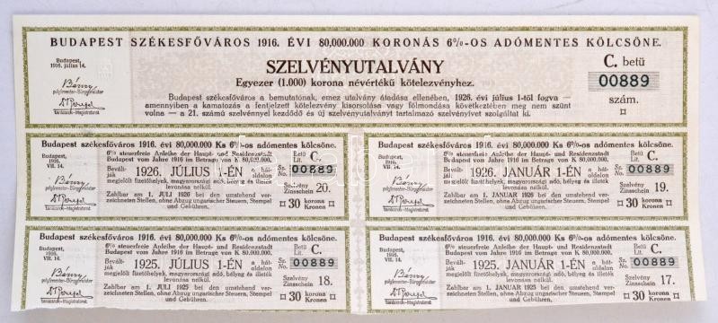 Leírás: 1916. "Budapest Székesfőváros" kötelezvénye 1000K-ról magyar és német nyelven, szelvényekkel és szárazpecséttel T:II