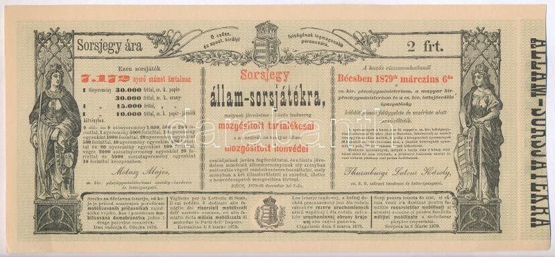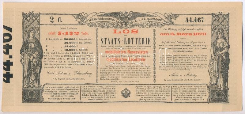 Ausztria / Bécs 1878. "Sorsjegy állam-sorsjátékra a közös hadsereg mozgósított tartalékosai s az osztrák és magyar állam mozgósított honvédei családjai javára" T:I- Austria / Vienna 1878. "State Lottery Ticket for the Reservist of the Joint Army and the Families of the mobilized Honved's" C:AU