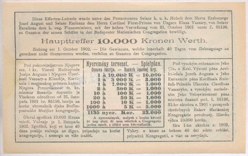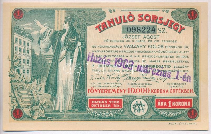 Leírás: Budapest 1903. "Tanuló Sorsjegy" 1K értékben, felülbélyegzéssel T:I-