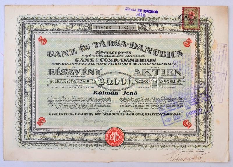 Budapest 1923. "Ganz és Társa-Danubius Gép-, Waggon- és Hajó-Gyár Részvénytársaság" névre szóló öt részvénye egyenként 20.000K-ról, magyar és német nyelvű, szárazpecséttel, bélyeggel és bélyegzésekkel, szelvényekkel T:III
