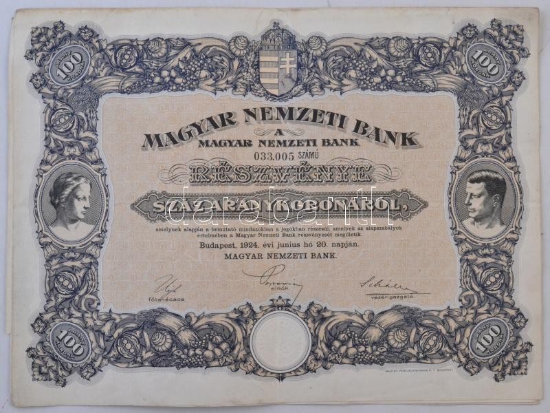 Budapest 1924. "Magyar Nemzeti Bank" magyar, angol, francia, német és olasz nyelvű részvénye 100 Arany Koronáról, szárazpecséttel és szelvényekkel T:III