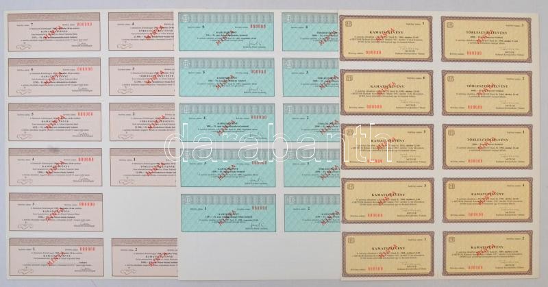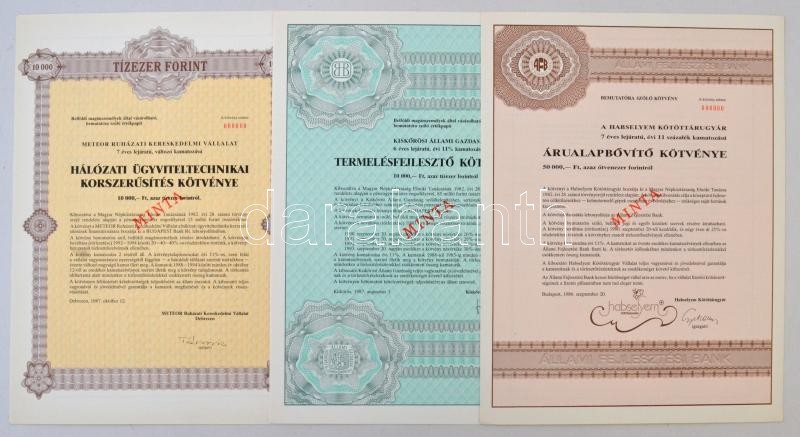Budapest 1986. "A Habselyem Kötöttárugyár 7 éves lejáratú, évi 11% kamatozású árulapbővítő kötvénye" 50.000Ft-ról, "MINTA", szelvényekkel + Kiskőrös 1987. "Kikőrösi Állami Gazdaság 6 éve lejáratú, évi 11% kamatozású termésfejlesztő kötvénye" 10.000Ft-ról, "MINTA", szelvényekkel + Debrecen 1987. "Meteor Ruházati Kereskedelmi Vállalat 7 éves lejáratú, változó kamatozású hálózati ügyviteltechnikai korszerűsítés kötvénye" 10.000Ft-ról, "MINTA", szelvényekkel T:I
