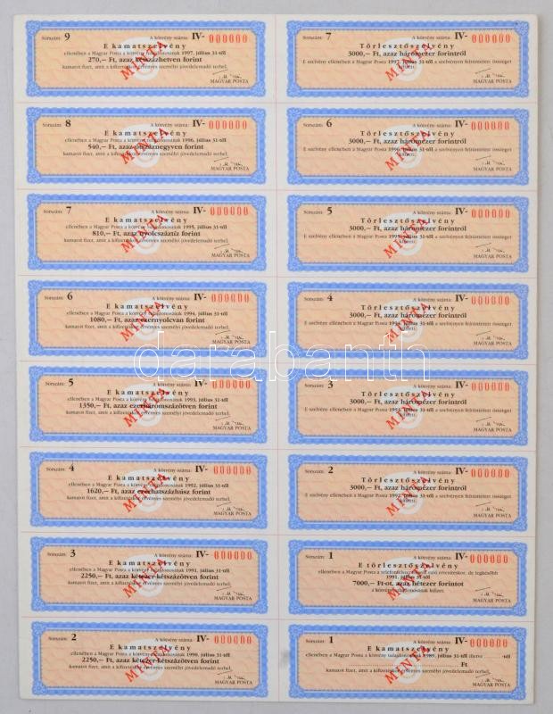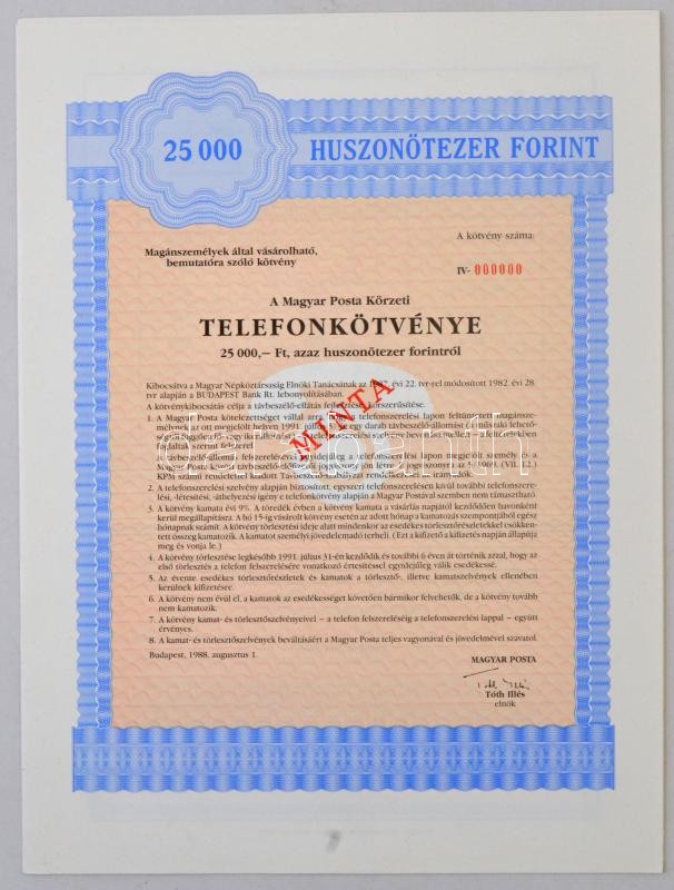Leírás: Budapest 1988. "Magyar Posta Körzeti Telefonkötvénye" 25.000Ft-ról, "MINTA", szelvényekkel T:I