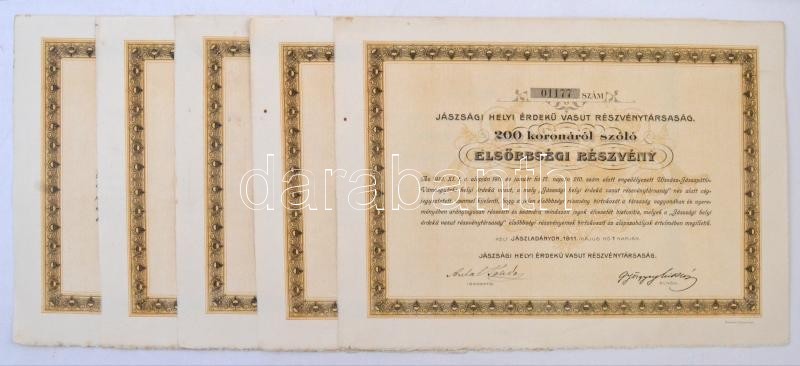 Leírás: Jászladány 1911. "Jászsági Helyi Érdekü Vasut Részvénytársaság" részvénye 200K-ról (5x) sorszámkövetők T:I-,II fo.