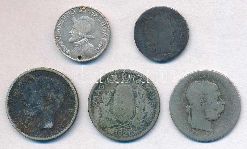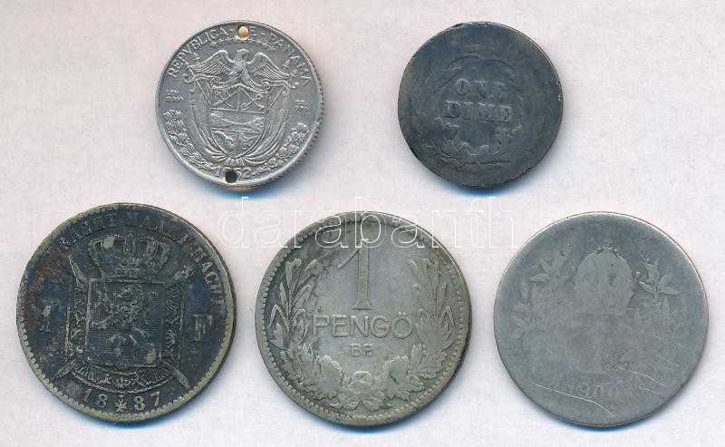 5db-os vegyes magyar és külföldi rossz tartású, sérült ezüstpénz tétel, közte Belgium 1887. 1Fr Ag "II. Lipót" T:2-,3 ly.
