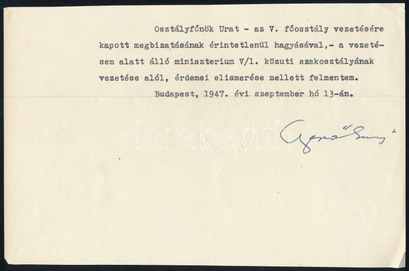 Leírás: 1947 Gerő Ernő közlekedési miniszter aláírása felmentésen