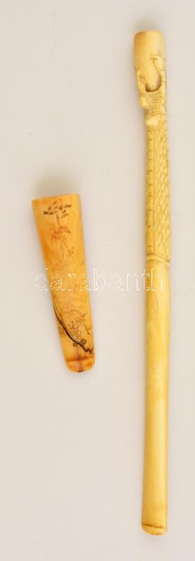 Leírás: 2 db díszes csont szipka, h: 6,5 ill. 18 cm