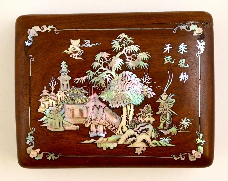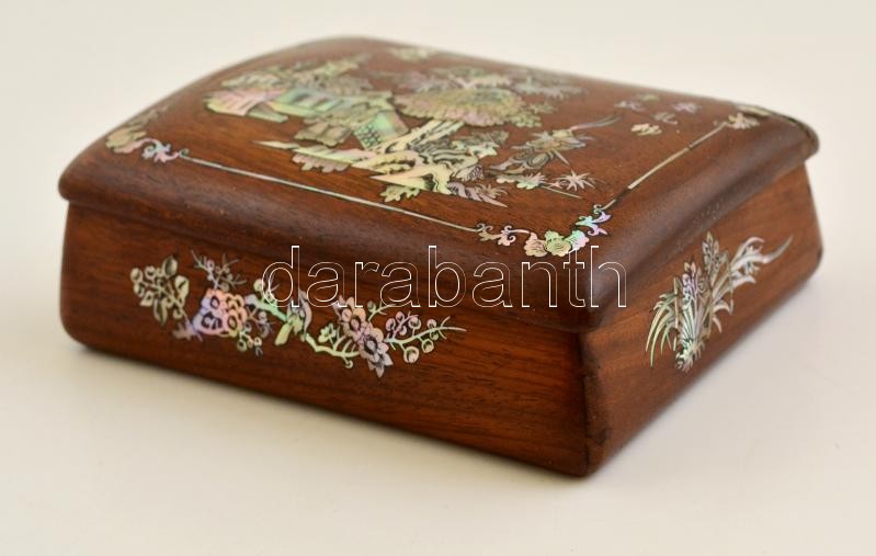 Leírás: Japán motívumos, gyöngyházberakásos fadoboz, kis repedéssel, 12x10x4 cm