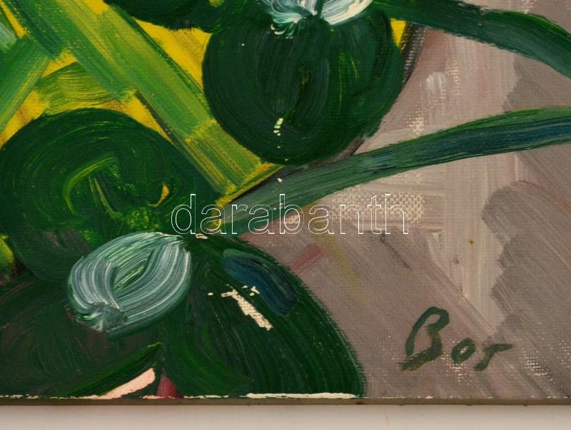 Leírás: Bor jelzéssel: Csendélet. Olaj, vászon, 44×49 cm