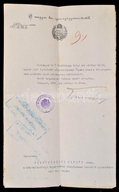 Leírás: 1921 Ügyészségi alelnöki kinevezés Szentkirályi Miklós ügyész részére, Tomcsányi Vilmos Pál (?-?) igazságügyminiszter aláírásával, fejléces papíron, bélyegzésekkel