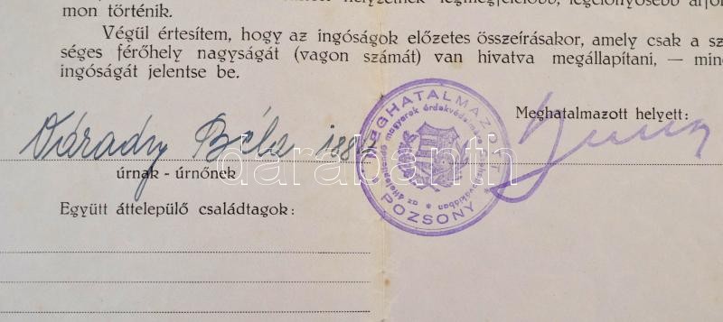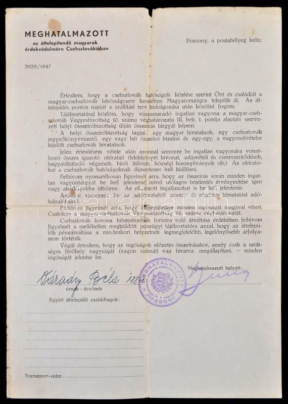 Leírás: 1947 Tájékoztató a Csehszlovákiából áttelepítésre kijelölt magyarok részére. bélyegzővel, aláírásokkal